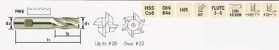 FINE PITCH ROUGHING END MILLS Short Length, Multi-Flute, Fine Pitch, Round Profile, with Flatted Shank 品名:粗加工钴高钢细纹铣刀 描述:短柄,多刃,细纹,圆齿形,平柄。