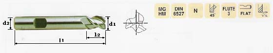 DIN 6527, THREE FLUTE MICRO GRAIN CARBIDE 45°HELIX END MILLS Short Length, 3 Flute, Center Cutting, 45°Helix, with Flatted Shank 品名:3刃45°螺旋角微晶硬质合金铣刀 德标DIN6527 描述:短柄,3刃,过中心,45°螺旋角,平柄。